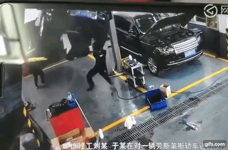 Đoạn video do camera an ninh ghi lại cho thấy, 2 người thợ mặc áo đen cùng sửa 1 chiếc Rolls-Royce Ghost màu đen đang nằm trên 1 cầu nâng. Bên cạnh còn có 1 chiếc Range Rover. Vài giây sau đó, chiếc xe siêu sang bất ngờ bị nâng lên.