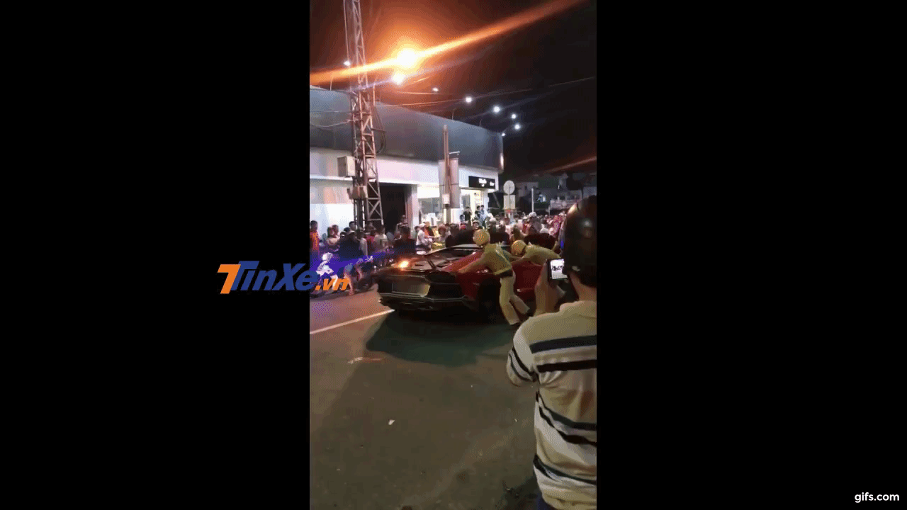 Người dân đứng 2 bên đường xem cảnh sát giao thông và những người khác đẩy siêu xe Lamborghini Aventador mui trần về phía sau để kiếm chỗ đỗ